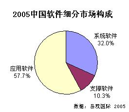 新華美通消息:易觀國際 發(fā)布的《IT 產(chǎn)品和服務(wù)-中國軟件市場年度綜合報告2005-2006》中數(shù)據(jù)顯示,2005年,中國軟件市場全年銷售額為324.4億元人民幣。同比增長22.2%。其中,系統(tǒng)軟件市場穩(wěn)定增長,市場規(guī)模達到103.8億元。支撐軟件市場增速提高,同比增長25.2%。應(yīng)用軟件市場規(guī)模達187.3億人民幣,相比2004年的151.2億增長了23.9%。其中市場對應(yīng)用軟件的需求量最大,占整個市場的57.7%。對系統(tǒng)軟件的需求居第二,占到32.0%,而支撐軟件則需求相對較小,占到10.3%的份額。