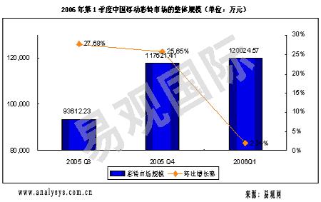 新華美通消息:易觀國際研究表明,2006年第一季度,CRBT 業(yè)務整體市場規(guī)模達到16億元,環(huán)比增長率為5%,增長速度較上個季度大幅度下降,業(yè)務已經(jīng)進入低級飽和期。其中中國移動的彩鈴業(yè)務的市場規(guī)模環(huán)比增長率僅僅為2%,如果扣除中國移動和中央電視臺合作進行的春晚彩鈴業(yè)務收入,中國移動彩鈴業(yè)務市場規(guī)模實際略有下降。
