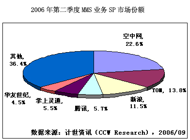 計世資訊(CCW Research)調(diào)研顯示。2006年第二季度,中國SMS業(yè)務市場規(guī)模達到118.3億元人民幣,其中SP收入12.1億元人民幣。TOM、騰訊和新浪排名前三位,分別占12.5%、9.6%和9.1%。其次為掌上靈通和空中網(wǎng),占8.6%和8.3%。