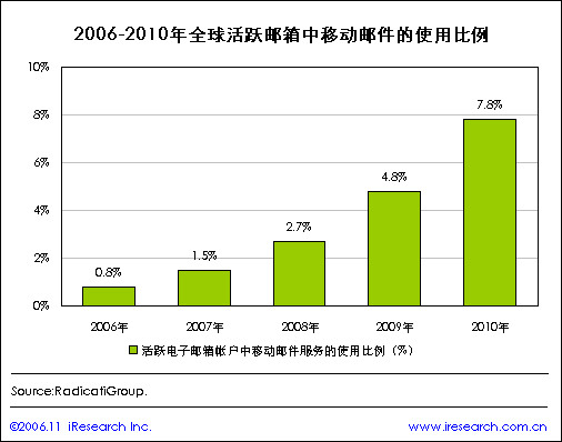 iResearch艾瑞市場(chǎng)咨詢(xún)根據(jù)市場(chǎng)咨詢(xún)公司RadicatiGroup公布的調(diào)查結(jié)果整理顯示,在2006年全球活躍電子郵箱賬號(hào)中有0.8%使用移動(dòng)電子郵件服務(wù),移動(dòng)電郵將會(huì)逐漸為高端用戶(hù)所接受,RadicatiGroup預(yù)計(jì)到2010年活躍電子郵箱賬號(hào)中使用移動(dòng)電郵服務(wù)的比例將達(dá)到7.8%.