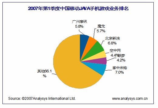 從企業(yè)實(shí)力和市場(chǎng)份額來(lái)看,目前手機(jī)游戲市場(chǎng)主要有三股力量組成,以空中等為代表的全業(yè)務(wù)線電信增值服務(wù)商(SP),以新浪等為代表的互聯(lián)網(wǎng)門(mén)戶綜合服務(wù)商,以米格、魔龍為代表的專業(yè)手機(jī)游戲產(chǎn)品與服務(wù)提供商(SP)。根據(jù)中國(guó)移動(dòng)“百寶箱”第1季度收入數(shù)據(jù),易觀注意到,掌中米格、北京新浪、廣州摩訊位列前三,前三名占據(jù)了近20%的市場(chǎng)份額。夢(mèng)網(wǎng)手機(jī)游戲精品業(yè)務(wù)的三家服務(wù)提供商第一季度收入排名為:米格、新浪、空中網(wǎng)!