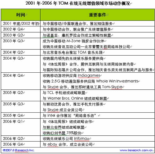 2000年中,TOM在線正式推出,這家一開始便以無線增值為特色的企業(yè)符合了當(dāng)時中國互聯(lián)網(wǎng)市場的環(huán)境,那時無線增值業(yè)務(wù)如火如荼,第五媒體的概念呼之欲出。隨后,便開始了與各大無線媒體、傳統(tǒng)媒體等一系列的合作和收購,所涉及的領(lǐng)域涵蓋短信、無線音樂、手機游戲、手機支付、手機體育新聞、即時通訊等許多行業(yè),一個龐大的無線媒體帝國看似已經(jīng)牢不可破。直到,2006年第四季度與ebay易趣合并,開始涉足電子商務(wù)。