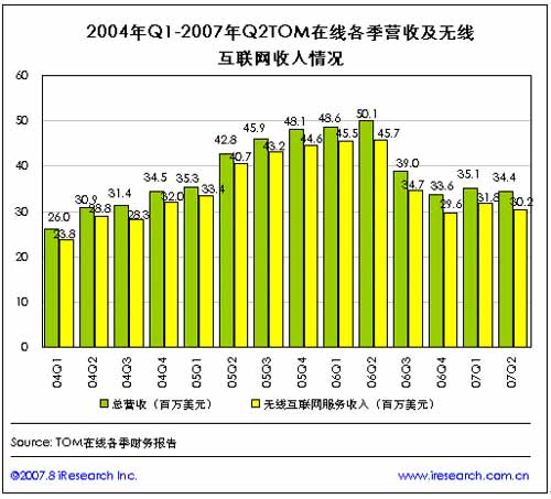 在2006年第二季度總營收以及無線互聯(lián)網(wǎng)服務(wù)收入分別達到歷史最高點(分別達到5010萬美元和4571萬美元)之后,TOM在線各季收入及無線互聯(lián)網(wǎng)收入呈逐季下滑趨勢,至2007年第二季度,TOM在線的總營收為3439萬美元,來自無線互聯(lián)網(wǎng)服務(wù)的收入為3024萬美元。