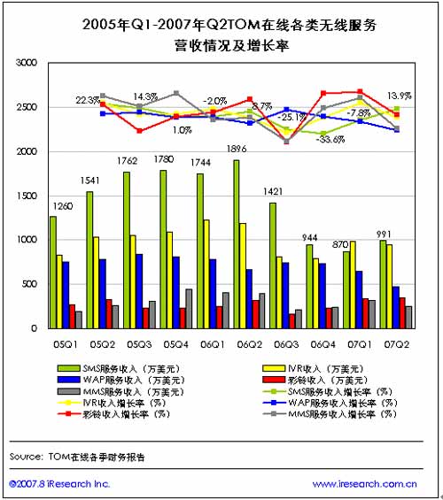 隨后,各無線服務(wù)收入則基本處于下滑趨勢,在2007年第二季度,除短信服務(wù)收入達到991萬美元,較上一季度增長13.9%之外,MMS收入僅246萬美元,環(huán)比減少23.1%,WAP服務(wù)收入為471萬美元,環(huán)比減少27.3%。