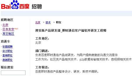 百度有意推IM產(chǎn)品的傳聞由來已久,不過該傳聞一直未得到官方證實(shí)。但在其官網(wǎng)最新公布的招聘頁面中,百度已向外界羅列出即時通信客戶端軟件研發(fā)工程師(搜索新產(chǎn)品研發(fā)部)、即時通信軟件產(chǎn)品經(jīng)理(客戶端軟件業(yè)務(wù)部)等職位,上述工作地點(diǎn)均在北京,可見百度的IM戰(zhàn)略布局已具雛形。