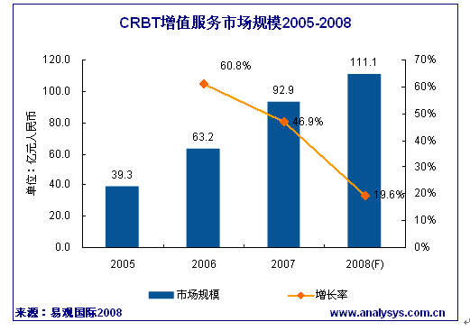 2007年中國CRBT市場規(guī)模達(dá)92.9億,保持較為高速的增長勢頭。