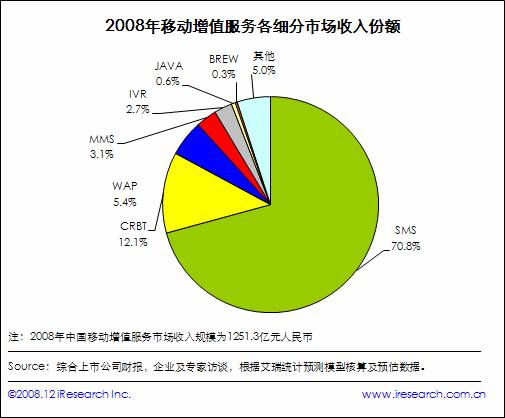 艾瑞研究發(fā)現(xiàn),2008年移動增值服務(wù)細(xì)分市場收入中SMS以70.8%的比例占據(jù)主導(dǎo)地位,但其他業(yè)務(wù)對SMS的分流和替代使其增長率有所下降;CRBT、WAP分別以12.1%和5.4%的比例位居第二、第三。