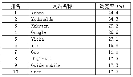 VRI的數(shù)據(jù)顯示,在手機網(wǎng)站瀏覽率TOP10的排名中,雅虎以44.4%的瀏覽率位居第一,google搜索以26.6%的瀏覽率位居第四,易查搜索以23.1%的瀏覽率緊隨其后,位居第五。雅虎作為綜合性門戶網(wǎng)站,不僅包括雅虎搜索,還包括雅虎電子商務(wù)。而麥當(dāng)勞手機網(wǎng)站以34.3%瀏覽率位居第二,用戶主要用于下載電子優(yōu)惠券。第三名是日本最大的電子商務(wù)網(wǎng)站樂天市場,其瀏覽率為29.2%。