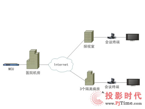 醫(yī)院的中心機(jī)房部署1臺(tái)多點(diǎn)控制單元(MCU),3個(gè)隔離病房、1個(gè)探視室各部署一套視頻會(huì)議終端、1個(gè)電視機(jī)/顯示器,網(wǎng)絡(luò)拓?fù)鋱D如下: