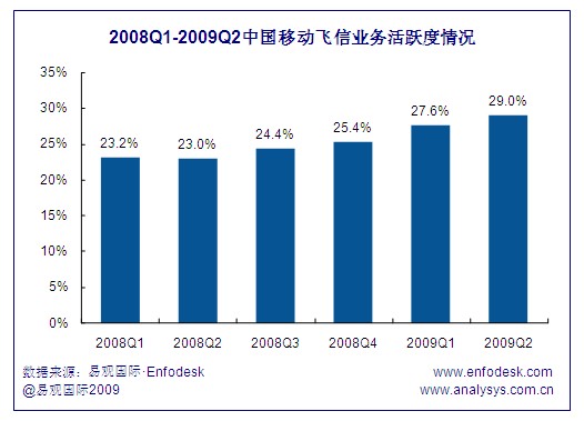 飛信用戶到達數(shù)的增長帶來了活躍用戶的穩(wěn)步提升,截止到2009年第2季度,飛信活躍用戶達到了5347萬,與2008年同期相比增長超過108.3%。由于一方面飛信到達數(shù)增長環(huán)比從2008年第2季度持續(xù)下跌,在2009年第2季度才止跌反彈,相比另一方面飛信活躍用戶的增長環(huán)比始終保持在15%以上,且從2008年第4季度開始飛信活躍用戶增幅持續(xù)擴大,因此近期飛信業(yè)務(wù)用戶活躍度表現(xiàn)出良好的增長勢頭。