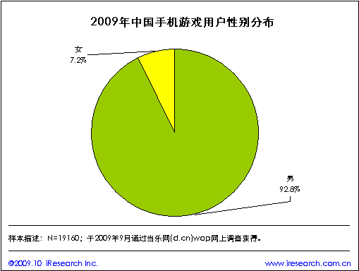 當(dāng)樂(lè)網(wǎng)調(diào)研數(shù)據(jù)顯示,2009年手機(jī)游戲用戶(hù)性別比例依然是男性居高。手機(jī)游戲用戶(hù)男性占比為92.8%,女性占比僅為7.2%。