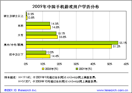 當(dāng)樂(lè)網(wǎng)調(diào)研數(shù)據(jù)顯示,2009年手機(jī)游戲用戶(hù)中高中(含中專(zhuān)、職高)部分的比例較2008年有所增長(zhǎng),增長(zhǎng)幅度達(dá)3.9個(gè)百分點(diǎn),其余各學(xué)歷階段的用戶(hù)比例則均出現(xiàn)不同程度的下降。