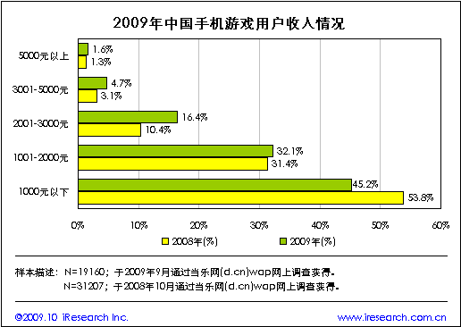 當(dāng)樂(lè)網(wǎng)調(diào)研數(shù)據(jù)顯示,2009年手機(jī)游戲用戶(hù)的月收入在1000~3000元之間的占比為48.5%,較2008年增長(zhǎng)6.7個(gè)百分點(diǎn)。收入高于2000元的中高收入用戶(hù)群體占22.7%,比2008年占比上升7.9個(gè)百分點(diǎn),收入在1000元以下的低收入群體占45.2%,比2008年占比減少8.6個(gè)百分點(diǎn)。與2008年對(duì)比,2009年手機(jī)游戲用戶(hù)的收入水平有明顯提高,用戶(hù)的消費(fèi)潛力有所增強(qiáng)。