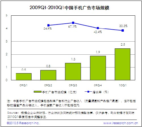 2010Q1中國手機(jī)廣告市場規(guī)模達(dá)到2.5億,環(huán)比增長30.3%.受季節(jié)性因素影響,手機(jī)廣告市場增速放緩,但是保持增長發(fā)展態(tài)勢。本季度,新聞、體育、數(shù)碼、女性和汽車類手機(jī)廣告市場表現(xiàn)良好,文本、橫幅、全屏以及客戶端軟件等手機(jī)廣告形式受到廣告主青睞。針對(duì)不同受眾群體進(jìn)行多重定向廣告營銷成為更多手機(jī)廣告服務(wù)提供商的實(shí)踐方向。盡管本季度手機(jī)廣告市場取得良好的市場表現(xiàn)力,但是廣告定價(jià)和廣告效果評(píng)估等制約手機(jī)廣告市場發(fā)展的關(guān)鍵因素仍將長期存在。
