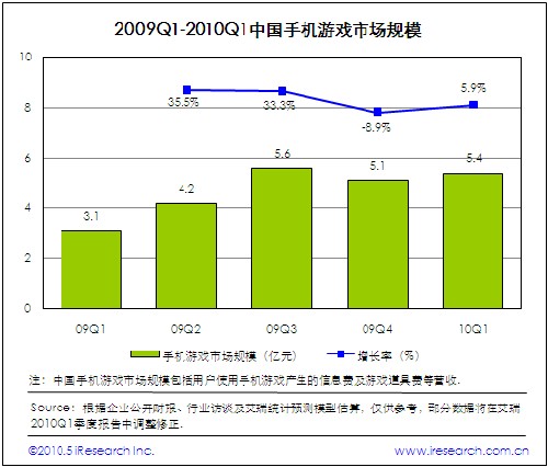 2010Q1中國手機(jī)游戲市場規(guī)模為5.4億,環(huán)比增長5.9%.2009年底電信運(yùn)營商調(diào)整業(yè)務(wù)合作伙伴計(jì)費(fèi)政策,導(dǎo)致WAP和G+手機(jī)游戲平臺(tái)等特定計(jì)費(fèi)平臺(tái)暫時(shí)停止計(jì)費(fèi),對(duì)手機(jī)游戲市場營收增長產(chǎn)生不利影響。除了季節(jié)因素以外,手機(jī)單機(jī)游戲受電信運(yùn)營商暫停WAP計(jì)費(fèi)影響較大,手機(jī)網(wǎng)游受政策影響有限。盡管本季度手機(jī)游戲市場扭轉(zhuǎn)營收規(guī)模下滑的不利局面,重新恢復(fù)增長態(tài)勢,但是手機(jī)游戲?qū)﹄娦胚\(yùn)營商計(jì)費(fèi)通道的高依存度,決定行業(yè)受政策風(fēng)險(xiǎn)的影響較大。實(shí)現(xiàn)營收多元化是手機(jī)游戲業(yè)界思考和關(guān)注的問題。