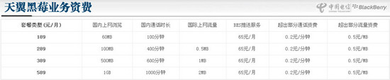 目前電信推出的黑莓手機(jī)套餐分為四類,一類為天翼黑莓簡裝版,價(jià)格為每月189元,包括60MB國內(nèi)上網(wǎng)流量,100分鐘國內(nèi)語音通話時(shí)長;第二類是天翼黑莓標(biāo)準(zhǔn)版套餐,價(jià)格為289元,包括100MB國內(nèi)上網(wǎng)流量,0.5MB國際上網(wǎng)流量,400分鐘國內(nèi)語音通話時(shí)長;第三類和第四類為天翼尊享版套餐包括389元和589元兩種資費(fèi),前者包括500MB國內(nèi)上網(wǎng)流量,1MB國際上網(wǎng)流量,600分鐘國內(nèi)語音通話時(shí)長;后者包括1GB國內(nèi)上網(wǎng)流量,2MB國際上網(wǎng)流量,1000分鐘國內(nèi)語音通話時(shí)長。