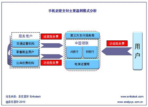 根據(jù)Enfodesk易觀智庫近期發(fā)布的《中國手機支付市場系列專題報告2010——近距支付》報告顯示,手機近距支付的主要盈利模式只有三種:即前向用戶服務費、結(jié)算手續(xù)費和后向商戶服務費。