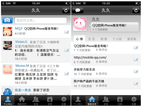 QQ空間foriPhone的外觀(guān)界面完全繼承了iPhone上應(yīng)用軟件的清新簡(jiǎn)潔風(fēng)格,軟件主界面包括個(gè)人中心、我的主頁(yè)、好友、應(yīng)用、設(shè)置五大功能。點(diǎn)擊個(gè)人中心可以看到自己的狀態(tài)、簽名以及好友的最新動(dòng)態(tài)。并且可以直接使用置頂?shù)呐恼真I拍照,即時(shí)拍照上傳至空間,使用置頂?shù)男那檩斎肟蛴涗涀约旱男那椤?br />