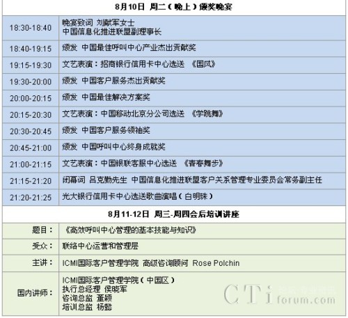 CTI論壇(ctiforum)8月3日消息(記者 潘婷婷):“第八屆中國(guó)呼叫中心產(chǎn)業(yè)高峰論壇暨第八屆中國(guó)最佳呼叫中心及最佳管理人頒獎(jiǎng)大會(huì)”定于2010年8月10日在上海國(guó)際貴都大飯店召開。此次大會(huì)是由中國(guó)信息化推進(jìn)聯(lián)盟客戶關(guān)系管理專業(yè)委員會(huì)主辦,ICMI國(guó)際客戶管理學(xué)院(中國(guó)區(qū))承辦。通過本次大會(huì),與會(huì)者將獲得中國(guó)最佳呼叫中心實(shí)踐經(jīng)驗(yàn)和最佳解決方案的分享,與業(yè)界精英共話呼叫中心和客戶關(guān)系管理的未來。