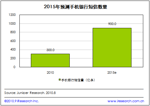艾瑞咨詢根據(jù)Juniper Research發(fā)布的預(yù)測(cè)數(shù)據(jù)發(fā)現(xiàn),由于新類型的手機(jī)銀行短信提醒的應(yīng)用,到2015年,全球手機(jī)銀行短信量將達(dá)到900億條每年,相當(dāng)于每個(gè)手機(jī)銀行用戶每隔一天就會(huì)收到一條銀行發(fā)來(lái)的信息。