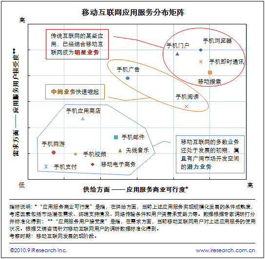 根據(jù)艾瑞咨詢近期發(fā)布的《2009-2010年中國移動互聯(lián)網(wǎng)行業(yè)發(fā)展報告》,移動互聯(lián)網(wǎng)各應用服務在“應用服務商業(yè)可行度”和“應用服務用戶接受度”兩個維度上被劃分為“明星業(yè)務”、“中間業(yè)務”和“潛力業(yè)務”三個類型。具備一定規(guī);l(fā)展市場條件,但還面臨若干限制因素的移動互聯(lián)網(wǎng)業(yè)務,將在未來逐步打開市場。