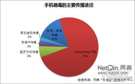 感染途徑方面,《2010年中國大陸地區(qū)手機(jī)安全報告》指出,據(jù)網(wǎng)秦“云安全”數(shù)據(jù)分析中心統(tǒng)計,當(dāng)前通過手機(jī)訪問wap和www網(wǎng)站感染病毒的比率達(dá)75%;通過短信、彩信感染病毒的比率占14%;通過藍(lán)牙傳輸方式感染病毒的比率占6%;通過存儲卡等途徑感染病毒的比率占3%;另外2%的用戶則是被其它傳播途徑的病毒感染。其中聯(lián)網(wǎng)感染病毒的機(jī)率最大,成為用戶面臨的最主要威脅。