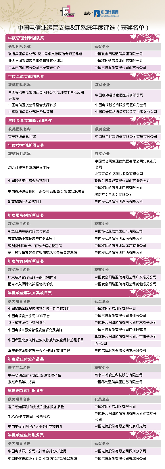 由中國計(jì)費(fèi)網(wǎng)(www.billingchina.com)主辦的“Awards2010”第四屆中國電信業(yè)運(yùn)營支撐&IT系統(tǒng)年度評選活動的結(jié)果于2011年元月31日隆重揭曉。自2010年12月1日評選活動正式啟動以來,歷時兩個月,來自國內(nèi)運(yùn)營商集團(tuán)、省級公司、IT產(chǎn)品與服務(wù)提供商的42家企業(yè)的優(yōu)秀產(chǎn)品、項(xiàng)目和團(tuán)隊(duì)共計(jì)70份參評項(xiàng)目入圍評選。經(jīng)過全面征集、選拔、初審以及評委團(tuán)的嚴(yán)格評審,評選結(jié)果已經(jīng)公示。在30位來自運(yùn)營商IT支撐、業(yè)務(wù)和服務(wù)部門的威權(quán)評委們的認(rèn)真評審后,共有27家企業(yè)分別獲得了30個Awards2010的團(tuán)隊(duì)/項(xiàng)目/產(chǎn)品/應(yīng)用服務(wù)的榮譽(yù)桂冠。