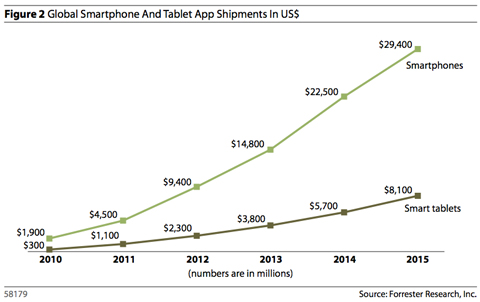 北京時間3月1日消息,據(jù)國外媒體報道,市場研究公司Forrester當(dāng)?shù)貢r間周一發(fā)表報告稱,到2015年,移動應(yīng)用市場規(guī)模將達到380億美元。
