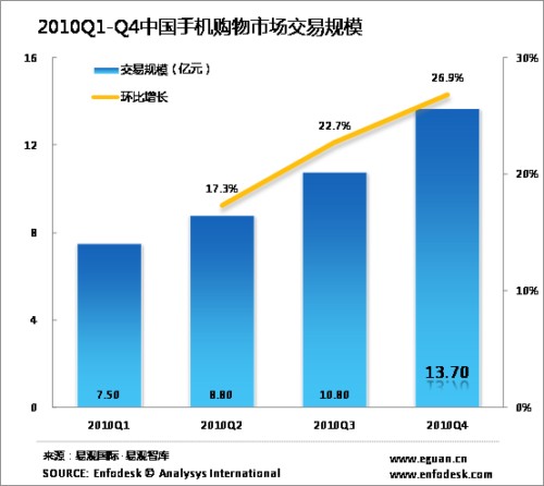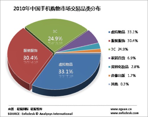 根據(jù)易觀智庫(kù)Enfodesk發(fā)布的《2010年第4季度中國(guó)手機(jī)購(gòu)物市場(chǎng)季度監(jiān)測(cè)》數(shù)據(jù)顯示,2010年中國(guó)手機(jī)購(gòu)物市場(chǎng)交易規(guī)模達(dá)到41億元。其中虛擬類商品交易規(guī)模達(dá)12億,占總體交易規(guī)模比例為33.1%。