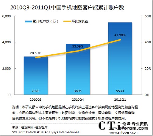 2011年第1季度中國手機(jī)地圖客戶端累計賬戶達(dá)5530萬