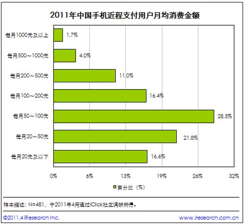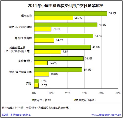 根據(jù)艾瑞咨詢近期發(fā)布的《2011年中國新興線下支付行業(yè)研究報告》的研究數(shù)據(jù)顯示,中國手機(jī)支付發(fā)生的場景主要集中在超市、便利店和商場等場所;并且,目前的中國用戶的手機(jī)支付金額,都以100元及以下的小額支付為主。
