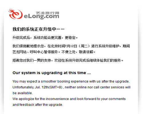 藝龍?jiān)庥龃鎯收戏⻊?wù)中斷20小時(shí) 呼叫中心暫停服務(wù)