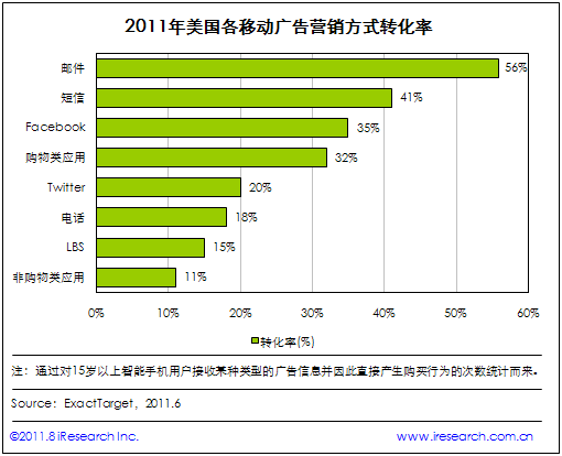 iResearch艾瑞咨詢(xún)整理ExactTarget調(diào)研數(shù)據(jù)時(shí)發(fā)現(xiàn):2011年在驅(qū)動(dòng)美國(guó)手機(jī)用戶(hù)產(chǎn)生購(gòu)買(mǎi)的移動(dòng)廣告營(yíng)銷(xiāo)方式中,電子郵件營(yíng)銷(xiāo)的轉(zhuǎn)化率最高,達(dá)到56%,短信、Facebook、購(gòu)物類(lèi)手機(jī)應(yīng)用(如Amazon、eBay、Groupon)以41%、35%、32%的轉(zhuǎn)化率依次位居二、三、四位。