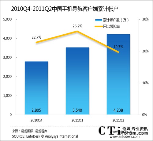 2011年Q2中國(guó)手機(jī)導(dǎo)航客戶端累計(jì)帳戶達(dá)4238萬(wàn)