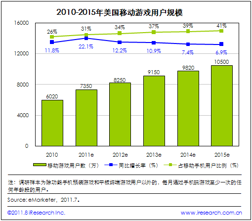 iResearch艾瑞咨詢根據(jù)eMarketer最新發(fā)布數(shù)據(jù)發(fā)現(xiàn),2010年美國(guó)移動(dòng)游戲用戶規(guī)模為6020萬人,同比增長(zhǎng)11.8%,占美國(guó)移動(dòng)手機(jī)用戶比例為26%;預(yù)計(jì)未來五年內(nèi),用戶規(guī)模將保持持續(xù)增長(zhǎng)勢(shì)態(tài),2011年將出現(xiàn)一個(gè)較高的增長(zhǎng)點(diǎn),移動(dòng)游戲用戶數(shù)將達(dá)到7350萬人,同比增長(zhǎng)22.1%,在移動(dòng)手機(jī)用戶中的滲透率達(dá)31%;之后增長(zhǎng)將逐漸趨緩,到2015年用戶規(guī)模將突破一億,達(dá)到1.05億,同比增長(zhǎng)率降為6.9%,滲透率達(dá)41%。