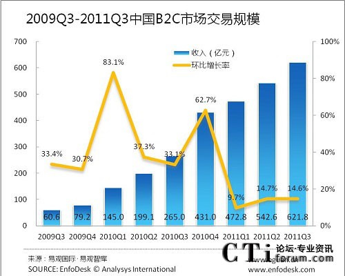 CTI論壇(ctiforum)10月25息(記者 張潔):根據(jù)易觀智庫EnfoDesk發(fā)布的《2011年第3季度中國B2C市場季度監(jiān)測》數(shù)據(jù)顯示,2011年第3季度中國B2C市場交易規(guī)模達到621億元,環(huán)比增長15%,同比增長137%。