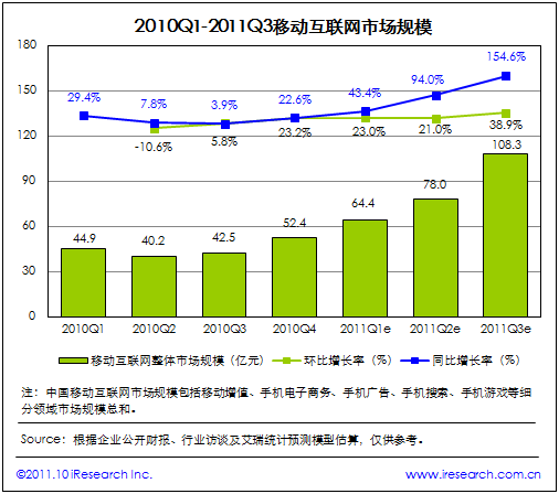 2011Q3中國(guó)移動(dòng)互聯(lián)網(wǎng)市場(chǎng)規(guī)模達(dá)108.3億元,爆發(fā)之勢(shì)初顯