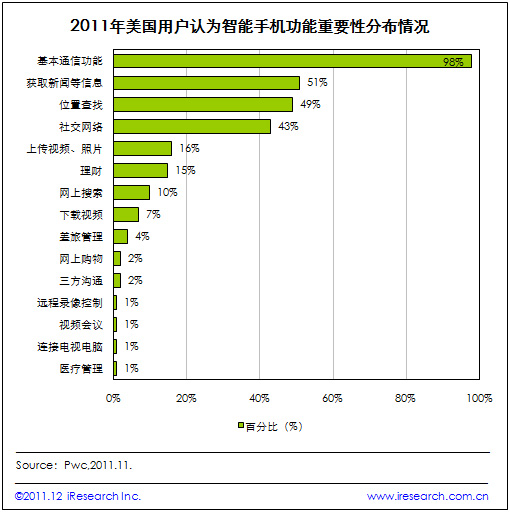艾瑞咨詢根據(jù)Pwc近日發(fā)布的美國(guó)移動(dòng)互聯(lián)網(wǎng)用戶演變研究報(bào)告發(fā)現(xiàn),用戶對(duì)移動(dòng)設(shè)備的使用和依賴程度增強(qiáng),同時(shí),通過(guò)對(duì)用戶使用智能手機(jī)功能的調(diào)查發(fā)現(xiàn),用戶認(rèn)為最重要的功能主要集中在基本通信、獲取資訊信息、位置查找和社交網(wǎng)絡(luò)上。