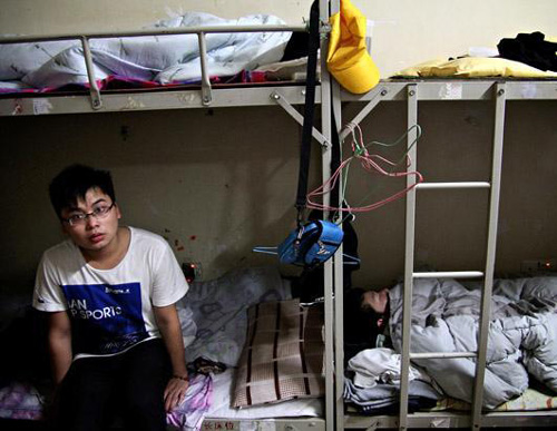 富士康一名員工從睡夢中醒來,而他的兩名同事仍在繼續(xù)睡覺。在富士康宿舍中,8名工人共用一個單間。