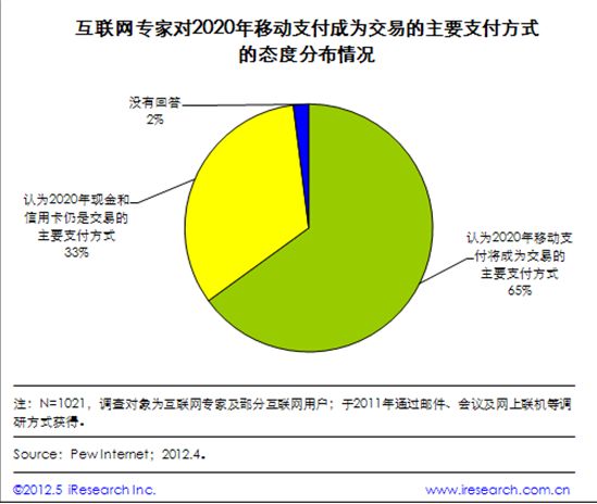 CTI論壇(ctiforum)6月13日消息(記者 楊佳林):據(jù)iResearch艾瑞咨詢整理Pew Internet調(diào)查數(shù)據(jù)發(fā)現(xiàn),多數(shù)互聯(lián)網(wǎng)專家認(rèn)為2020年移動支付將取代現(xiàn)金和信用卡成為主流支付方式。其中,65%的受訪專家認(rèn)為到2020年,大多數(shù)消費(fèi)者將采用智能刷卡終端進(jìn)行支付;然而33%的專家不贊成這種推測,他們認(rèn)為到2020年,現(xiàn)金和信用卡將仍然是主要的支付方式,消費(fèi)者對NFC技術(shù)安全性的擔(dān)憂及主要貨幣電子轉(zhuǎn)換技術(shù)的限制會阻礙移動支付的進(jìn)一步發(fā)展。