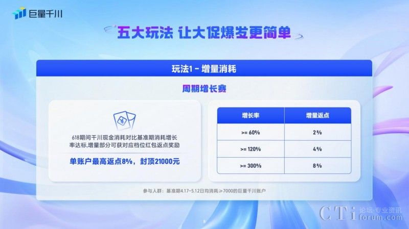 一、「周期增長賽」:針對在618好物節(jié)期間現(xiàn)金消耗對比基準(zhǔn)期消耗增長率達(dá)標(biāo)的商家,增量部分可獲得對應(yīng)檔位紅包返點(diǎn)獎勵,單賬戶最高返點(diǎn)8%,封頂21000元。
