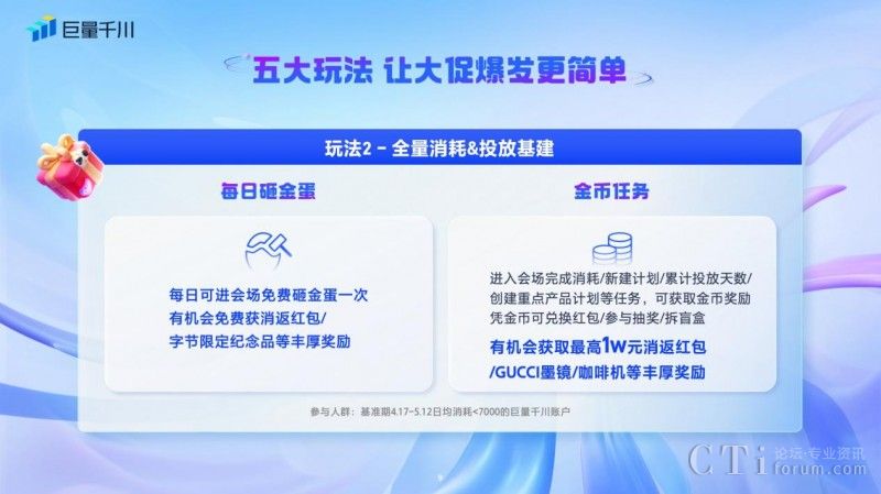 二、「每日砸金蛋&金幣任務(wù)」:針對在618好物節(jié)期間現(xiàn)金消耗對比基準(zhǔn)期消耗增長率未達(dá)標(biāo)的商家,可參與每日砸金蛋和金幣任務(wù)。商家每日可進(jìn)入會場免費(fèi)砸金蛋一次,就有機(jī)會免費(fèi)獲得消返紅包和字節(jié)限定紀(jì)念品等獎勵。此外,商家進(jìn)入會場完成消耗/新建計劃/累計投放天數(shù)/創(chuàng)建重點(diǎn)產(chǎn)品計劃等任務(wù),可獲取金幣獎勵,憑金幣可兌換紅包、參與抽獎和拆盲盒等豐厚獎勵,最高可得10000元消返紅包。