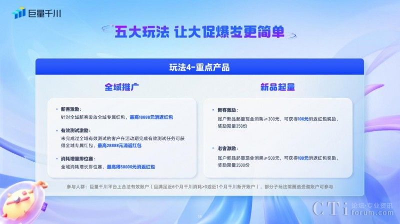 四、「重點(diǎn)產(chǎn)品玩法」:「全域推廣」和「新品起量」兩個巨量千川平臺重點(diǎn)產(chǎn)品,也推出了系列玩法。全域推廣對新客、完成有效測試的客戶發(fā)放全域推廣專屬紅包,最高達(dá)28888元,參與全域增長消耗排位賽也可獲得高達(dá)50000元的消返紅包。新品起量基準(zhǔn)期新客現(xiàn)金消耗≥300元,可獲得100元消返紅包獎勵,老客現(xiàn)金消耗≥500元,即可得到100元消返紅包獎勵。