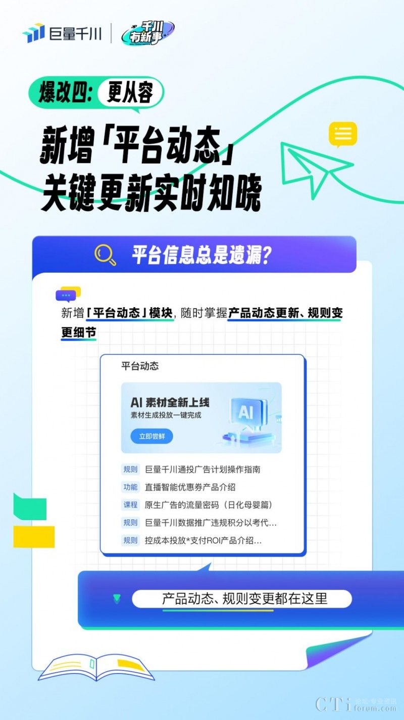 巨量千川首頁升級還增設了「平臺動態(tài)」模塊,實時呈現(xiàn)平臺產(chǎn)品更新、規(guī)則變更等信息,讓商家可以及時了解平臺最新動態(tài),把握生意增長機遇。