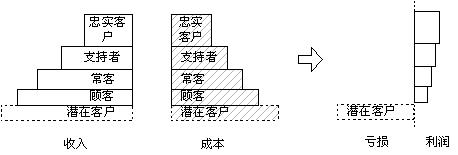 科特勒根據客戶的忠誠度給了我們一個階梯,這是客戶關系管理工作的良好參照,同時也可作為客戶關系管理工作考核的工具。我們將這個階梯做如下改造:每個層次的寬度是此級次客戶的數(shù)量,每個層次的高度是此級次客戶給企業(yè)帶來的收入,我們可以得到一個企業(yè)收入客戶分布結構圖,如右圖所示: 從圖中可以很清楚的看出客戶管理工作的內容:層次寬度(每個層次客戶的數(shù)量)和層次的高度(每個層次客戶的平均贏利水平)。 |