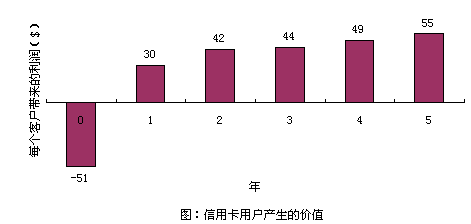 以信用卡服務(wù)為例,爭(zhēng)取一個(gè)新的用戶平均要51美圓,用于廣告、推銷和開戶等開支。用戶開始時(shí)花錢很少,但為公司帶來一定的利潤(rùn)。但如果用戶繼續(xù)使用到第二年,就會(huì)為公司帶來更多的經(jīng)濟(jì)效益,因?yàn)楣九c客戶之間的信任和客戶對(duì)公司的滿意,致使客戶更多地通過信用卡消費(fèi)。(圖:"信用卡用戶產(chǎn)生的價(jià)值")用戶貢獻(xiàn)在增加,公司的運(yùn)作費(fèi)用卻在不斷減低。信用卡公司可以不斷減少對(duì)客戶信用的審核時(shí)間。保持長(zhǎng)期的客戶關(guān)系,還可以減少廣告支出,客戶本身就是一個(gè)免費(fèi)的廣告資源。很多人在消費(fèi)前喜歡聽取朋友的意見,覺得比廣告更可信。