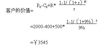 下面舉另一個(gè)例子具體說明客戶價(jià)值的計(jì)算: 假設(shè)客戶與公司保持交易時(shí)間:N=5年;公司最初吸引每個(gè)客戶的成本(營銷費(fèi)用): C0=¥400;客戶第一次購買的產(chǎn)品價(jià)格:P0=¥2000;公司期望每年從每個(gè)客戶處增加的收入:R=¥500;利率(一般指貸款利率): r =9%;那么客戶的價(jià)值等于:客戶初次購買產(chǎn)品和以后幾年每年消費(fèi)價(jià)值的折現(xiàn)之和,減營銷成本,即: