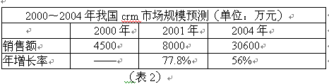 國內(nèi)CRM市場經(jīng)過一段時(shí)間的快速增長,2000年銷售額達(dá)到4500萬元左右。2001年市場情況將更好,預(yù)計(jì)銷售額將是上年的兩倍左右。CCID根據(jù)大量調(diào)查分析,對我國CRM市場規(guī)模作出如下預(yù)測: