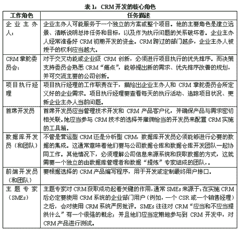 表1列出了CRM開發(fā)團(tuán)隊(duì)中的核心工作功能。在開始著手一個開發(fā)項(xiàng)目之前,確保已經(jīng)考慮了下面的每一種角色;并且從公司內(nèi)部和外部來理解勝任這些角色所必需的技能。