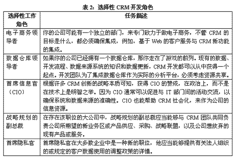 根據(jù)你的CRM項(xiàng)目的廣泛性和復(fù)雜性,對于在表2中列出的工作角色,你可以有選擇地在CRM開發(fā)中添加。